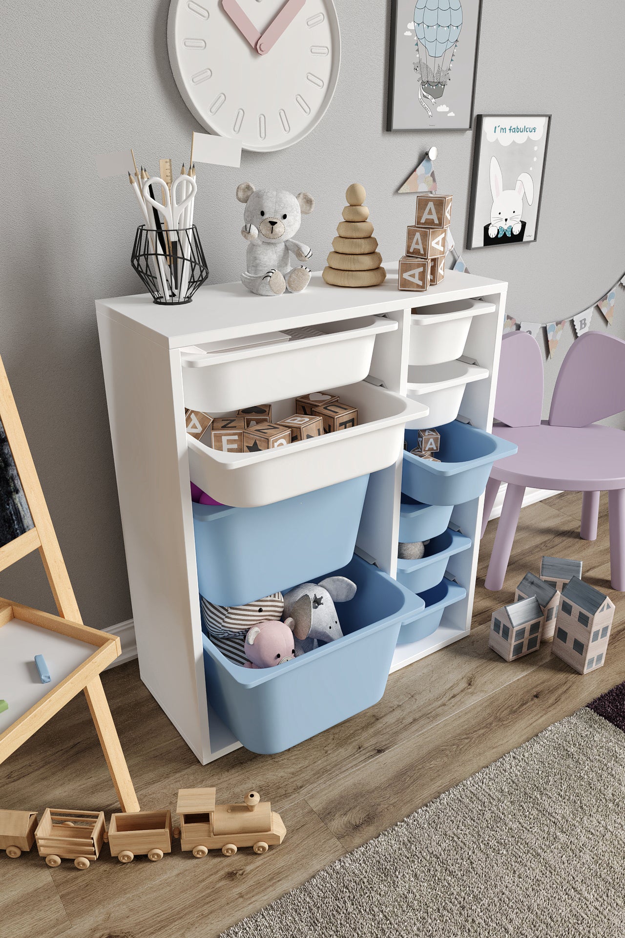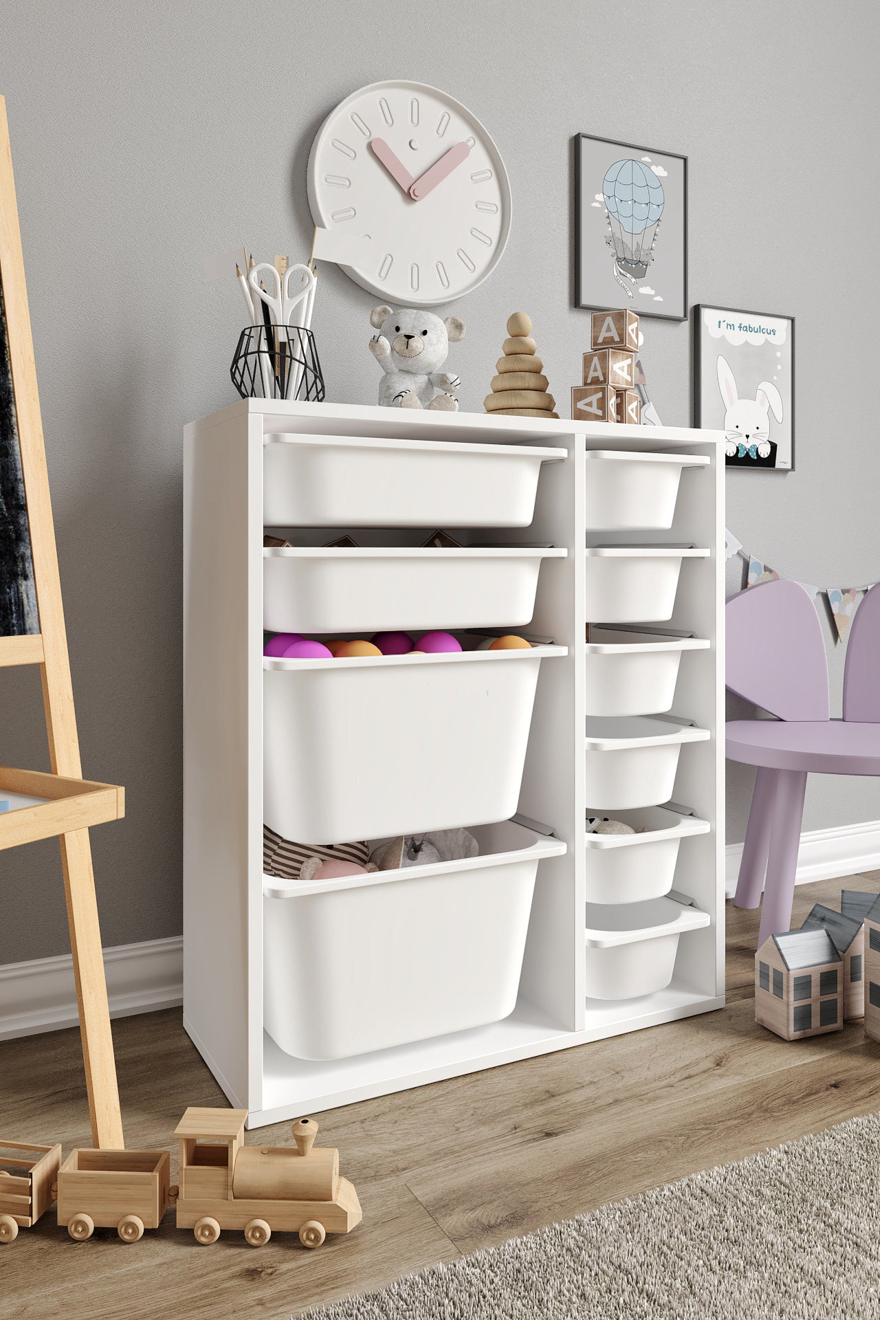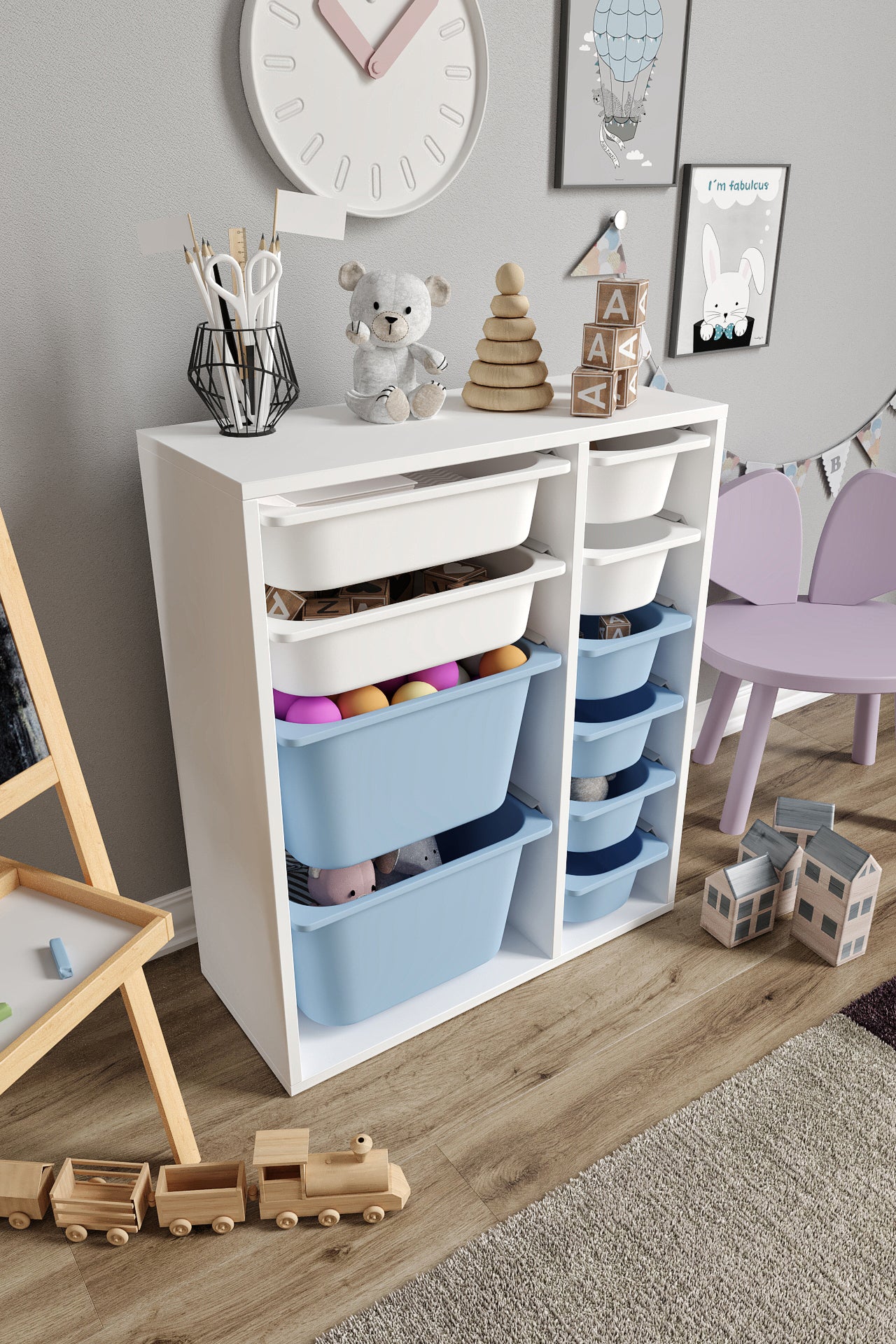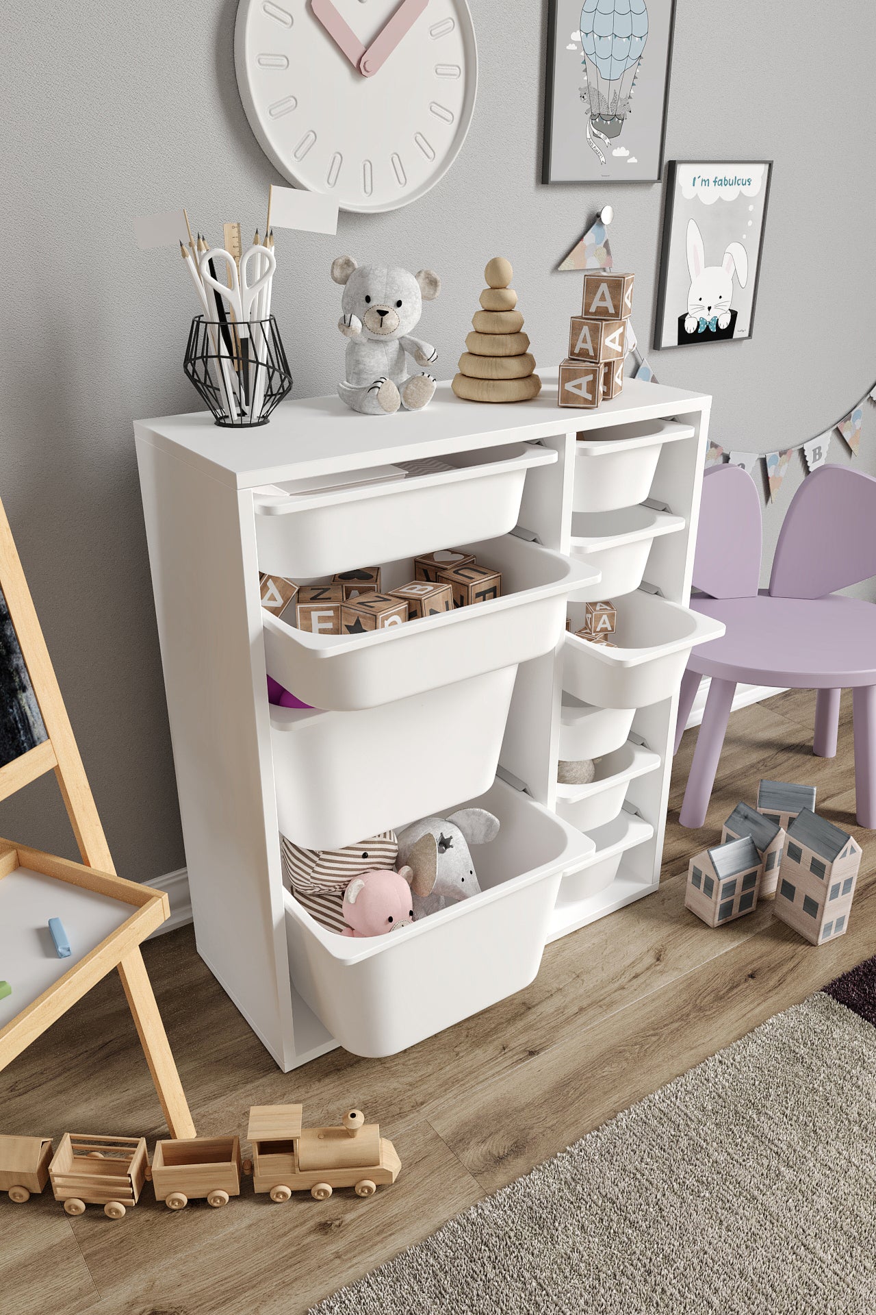 Spielzeugschrank mit 10 Körben, 100 % MDF (2 große Körbe, 2 mittelgroße Körbe, 6 kleine Körbe)