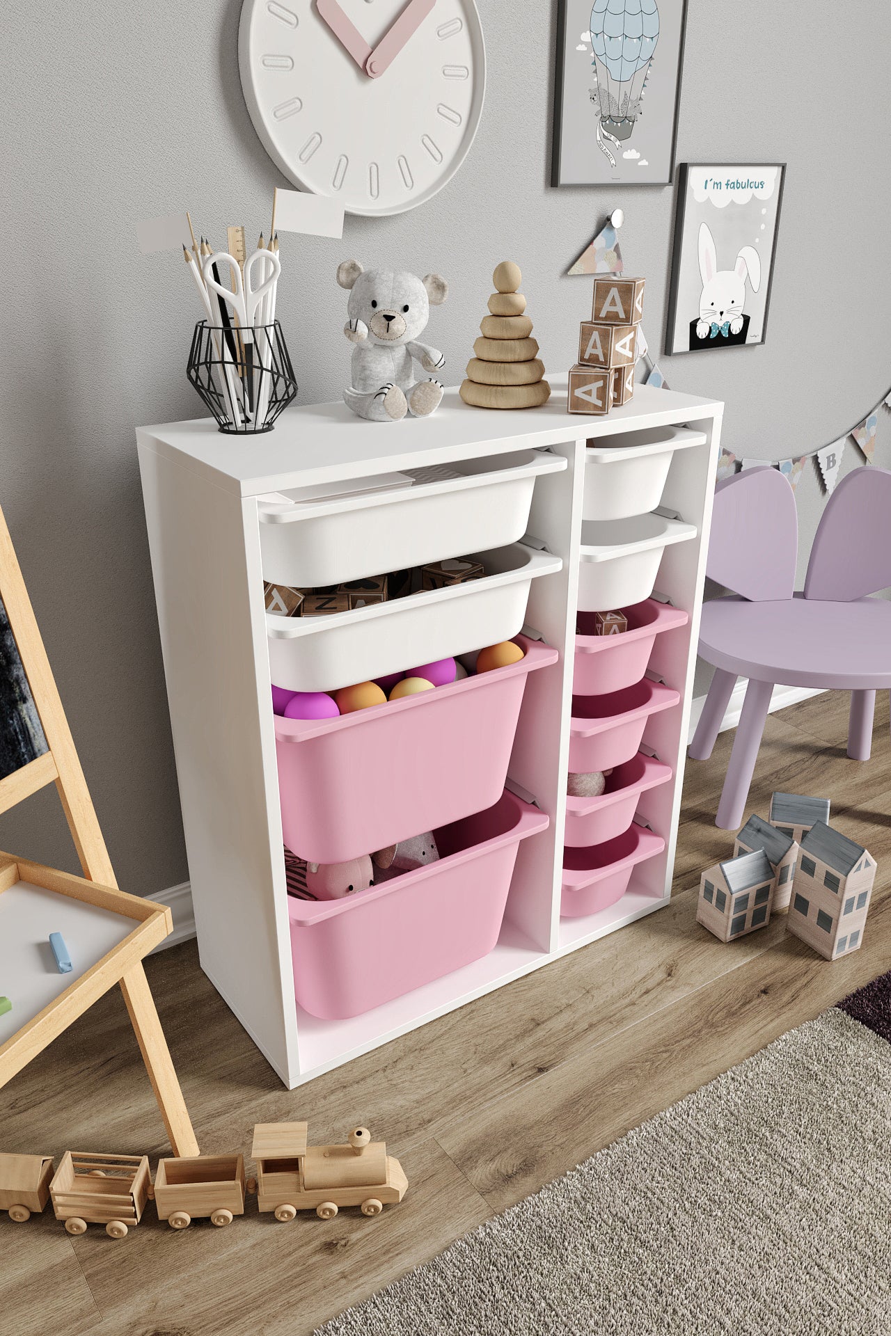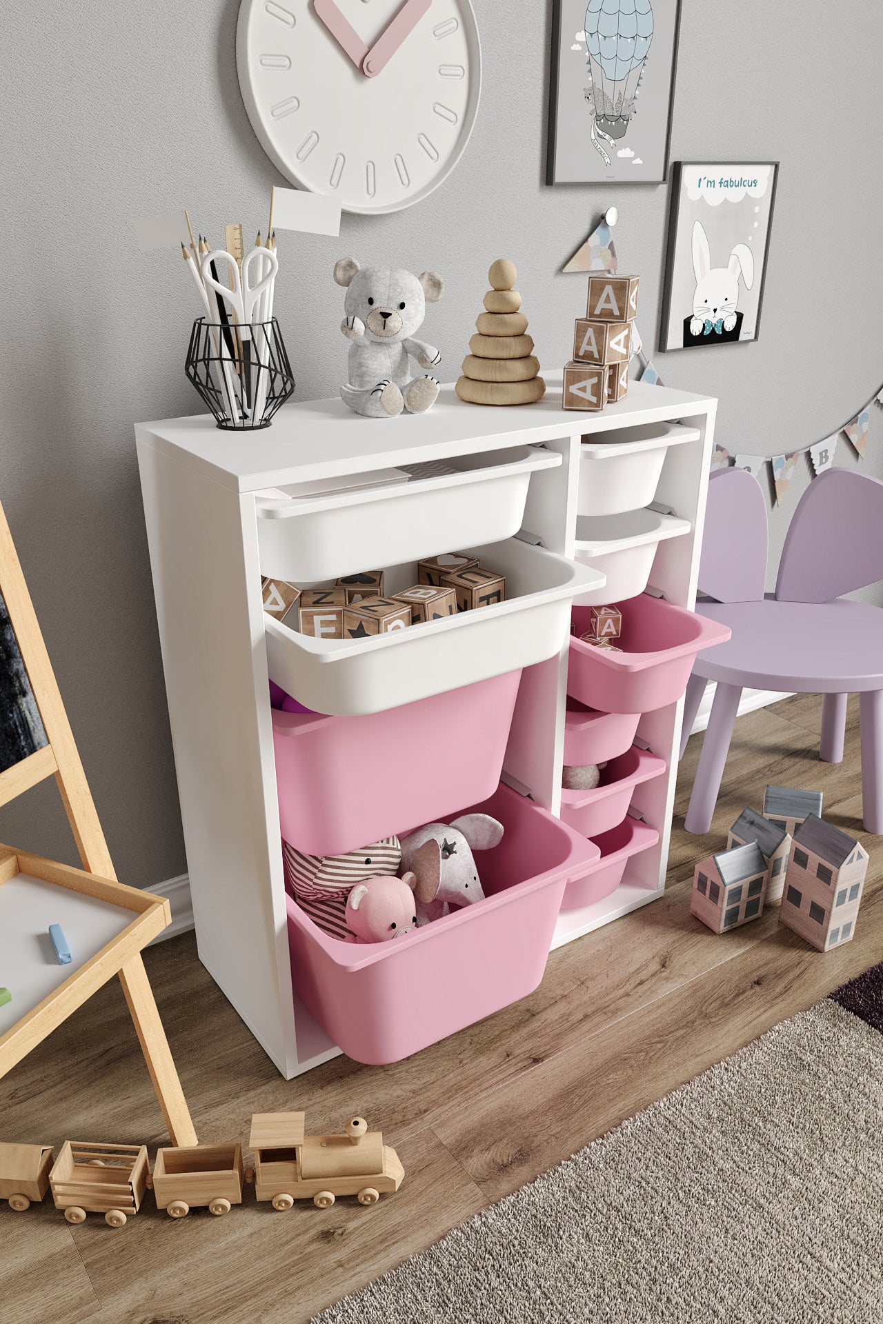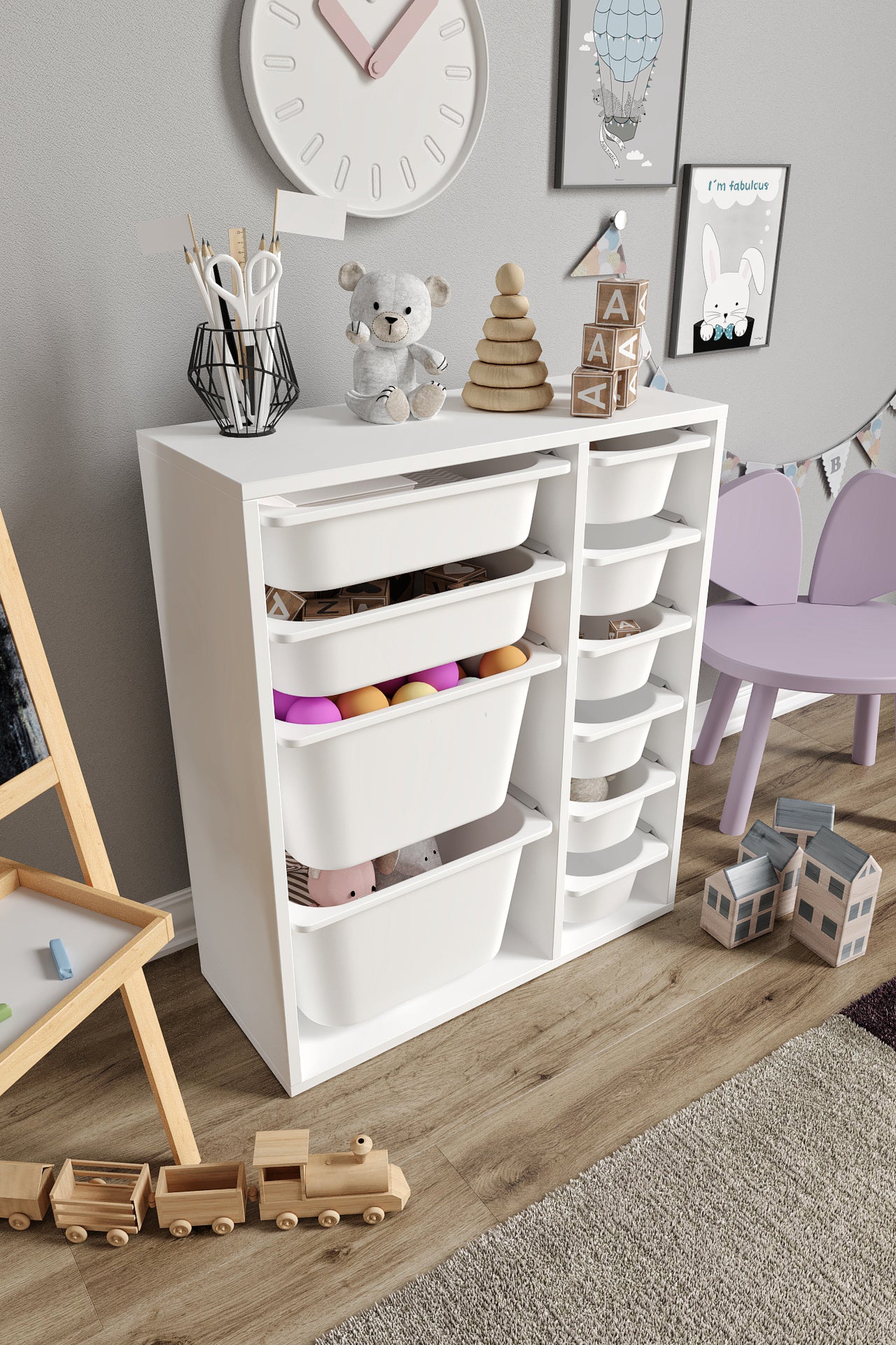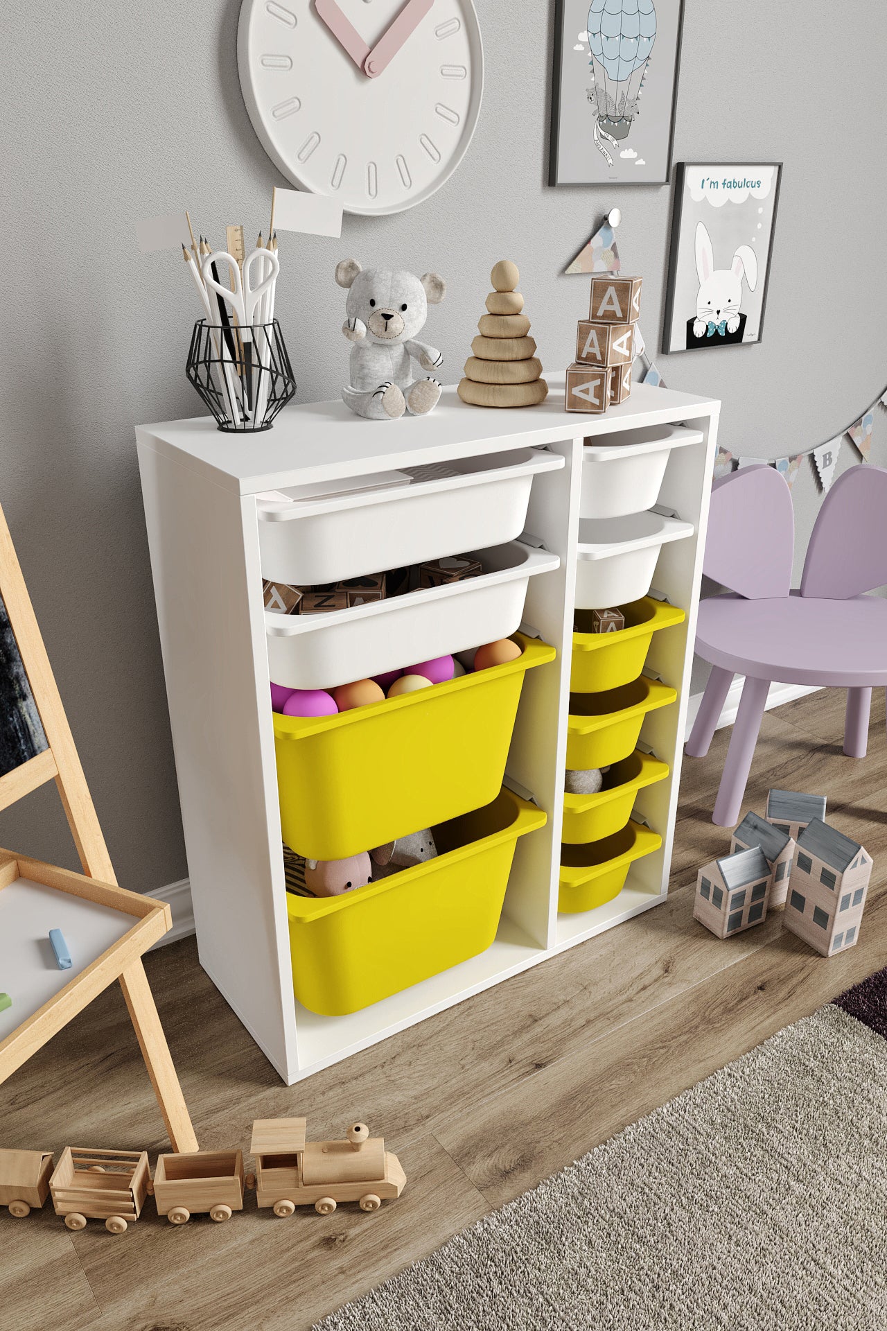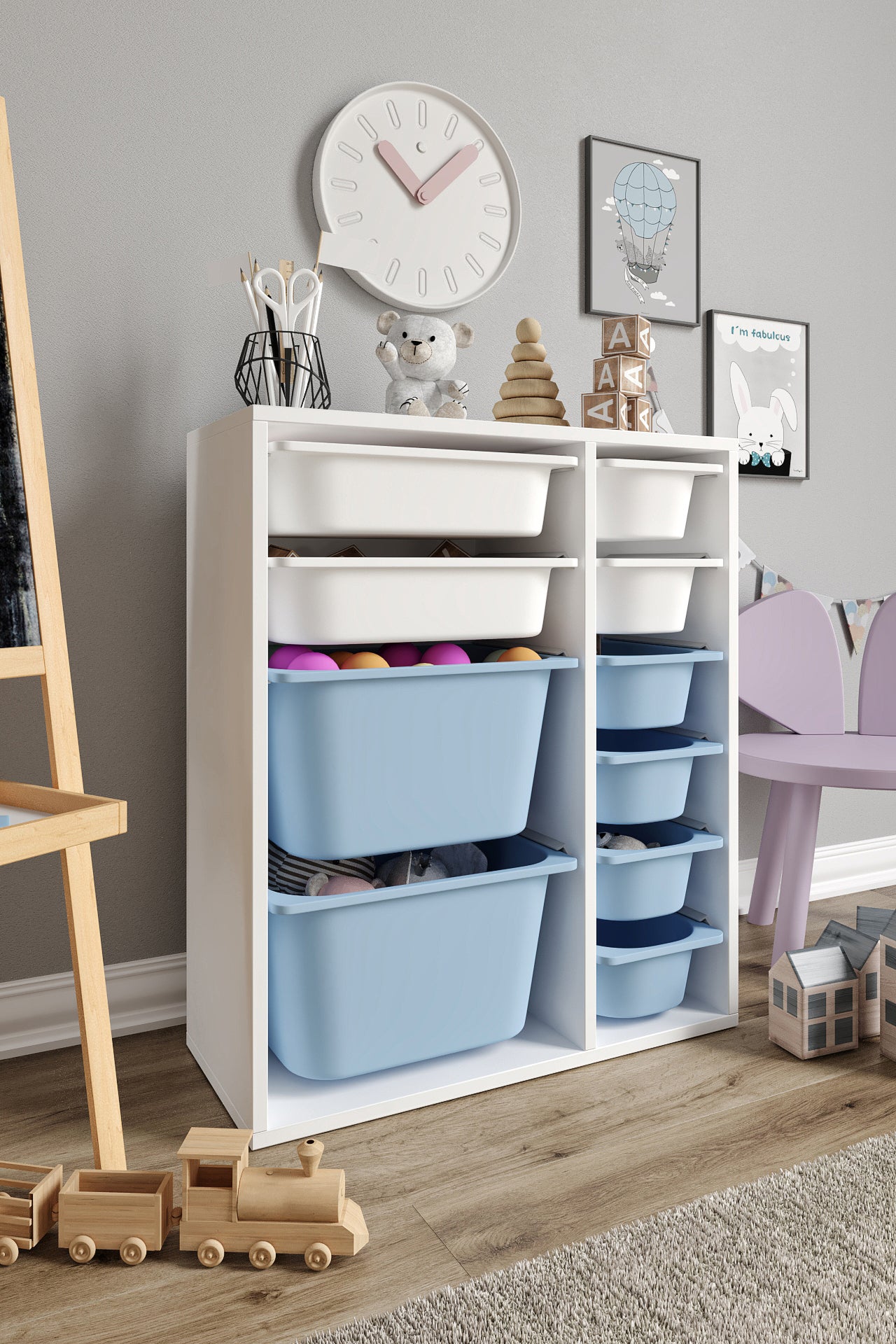 Spielzeugschrank mit 10 Körben, 100 % MDF (2 große Körbe, 2 mittelgroße Körbe, 6 kleine Körbe)