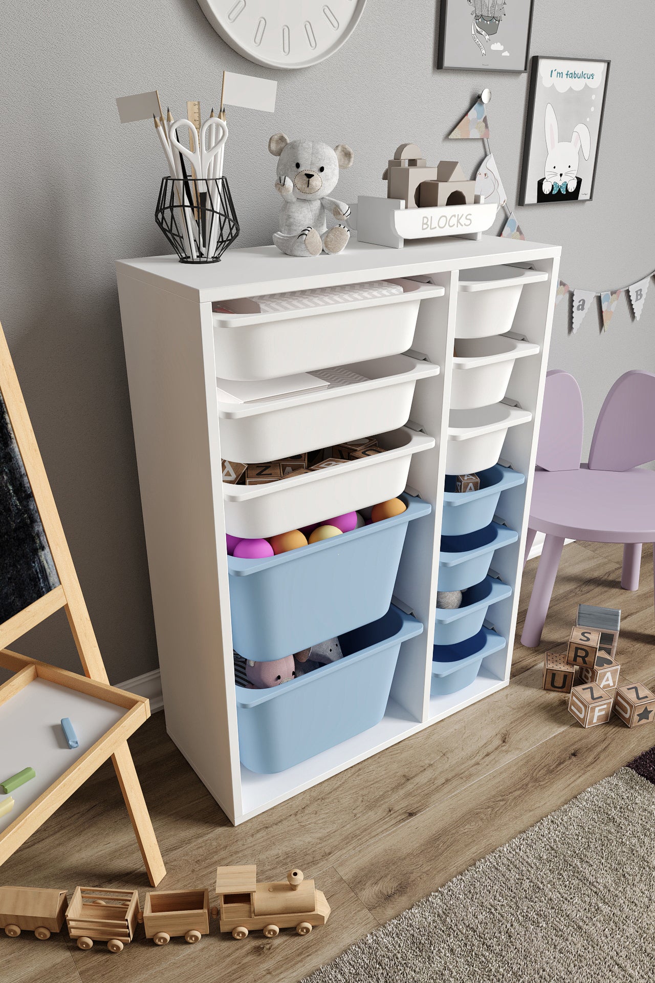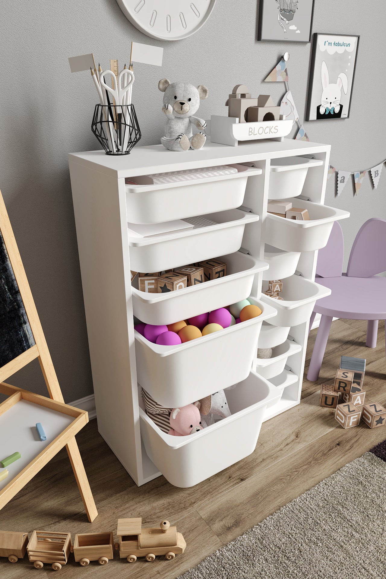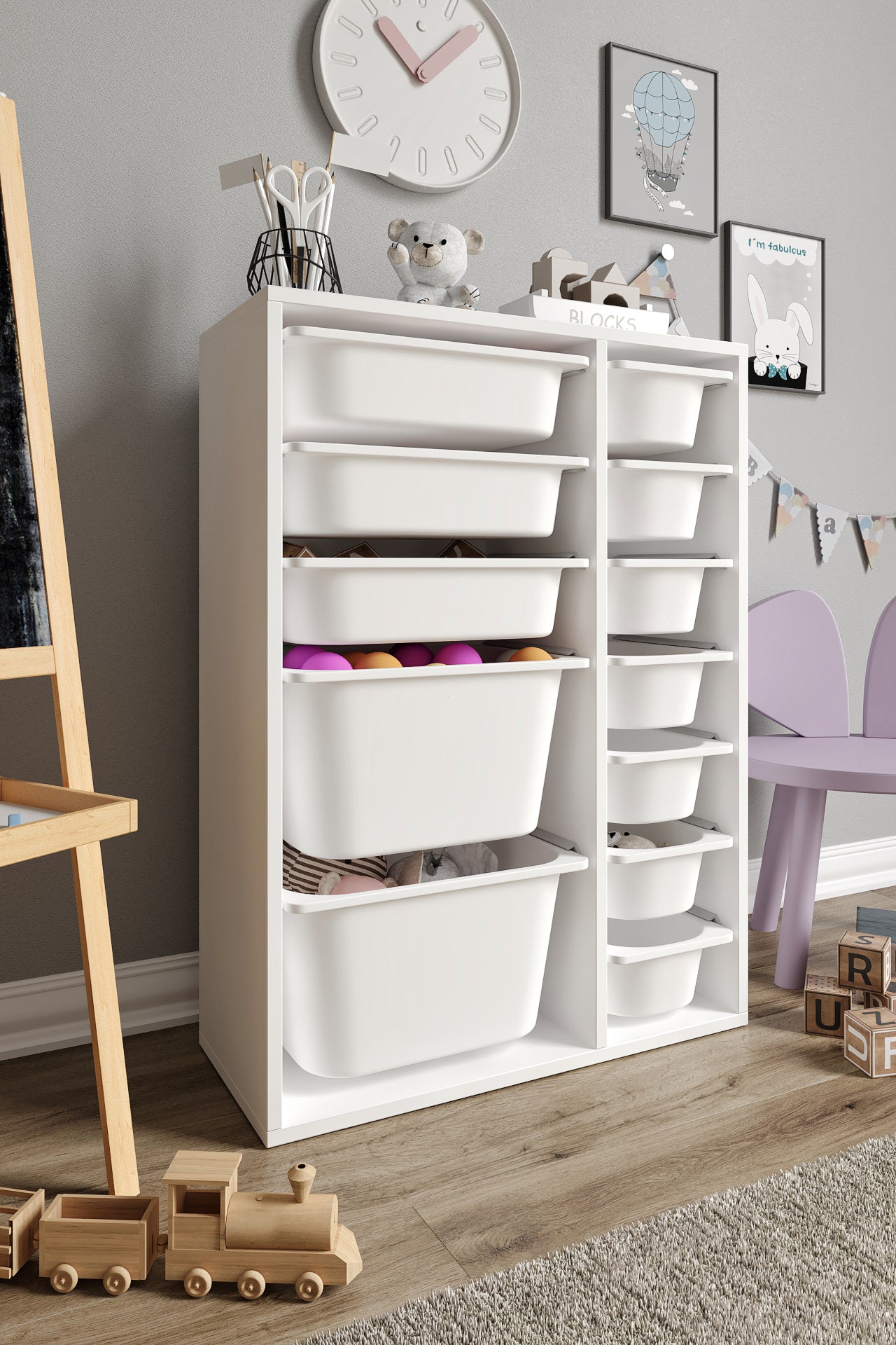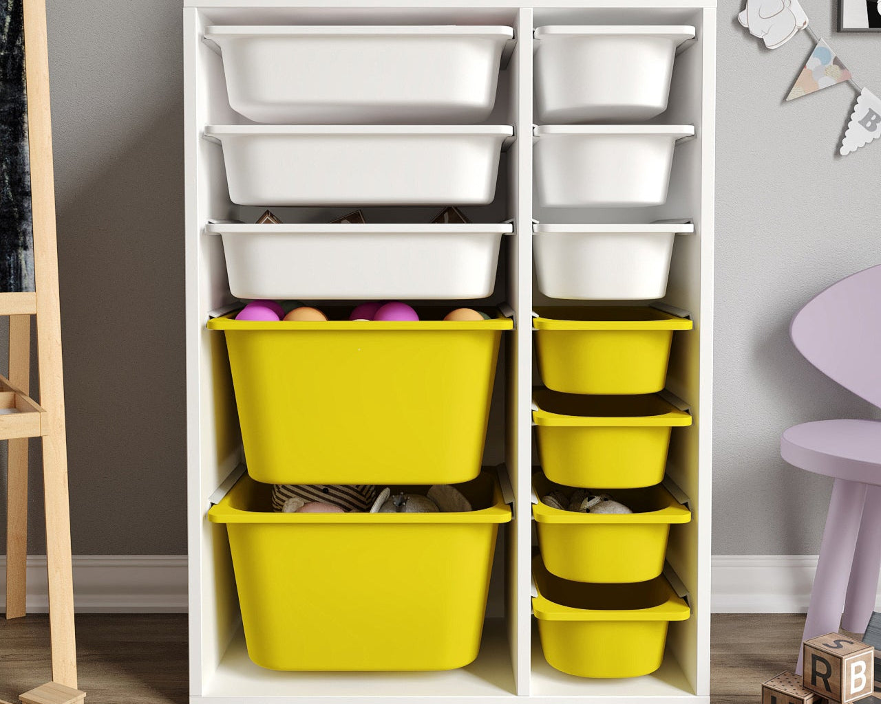 Spielzeugschrank aus 100 % MDF mit 12 Körben (2 große, 3 mittlere Körbe, 7 kleine Körbe)