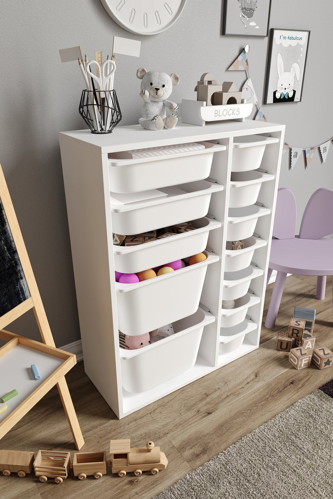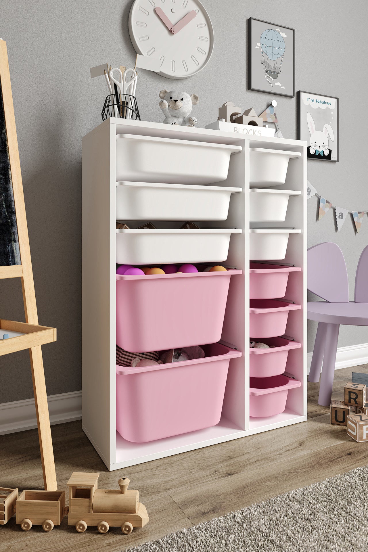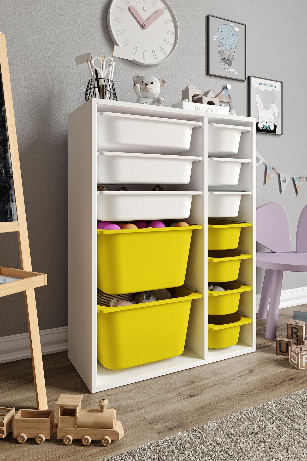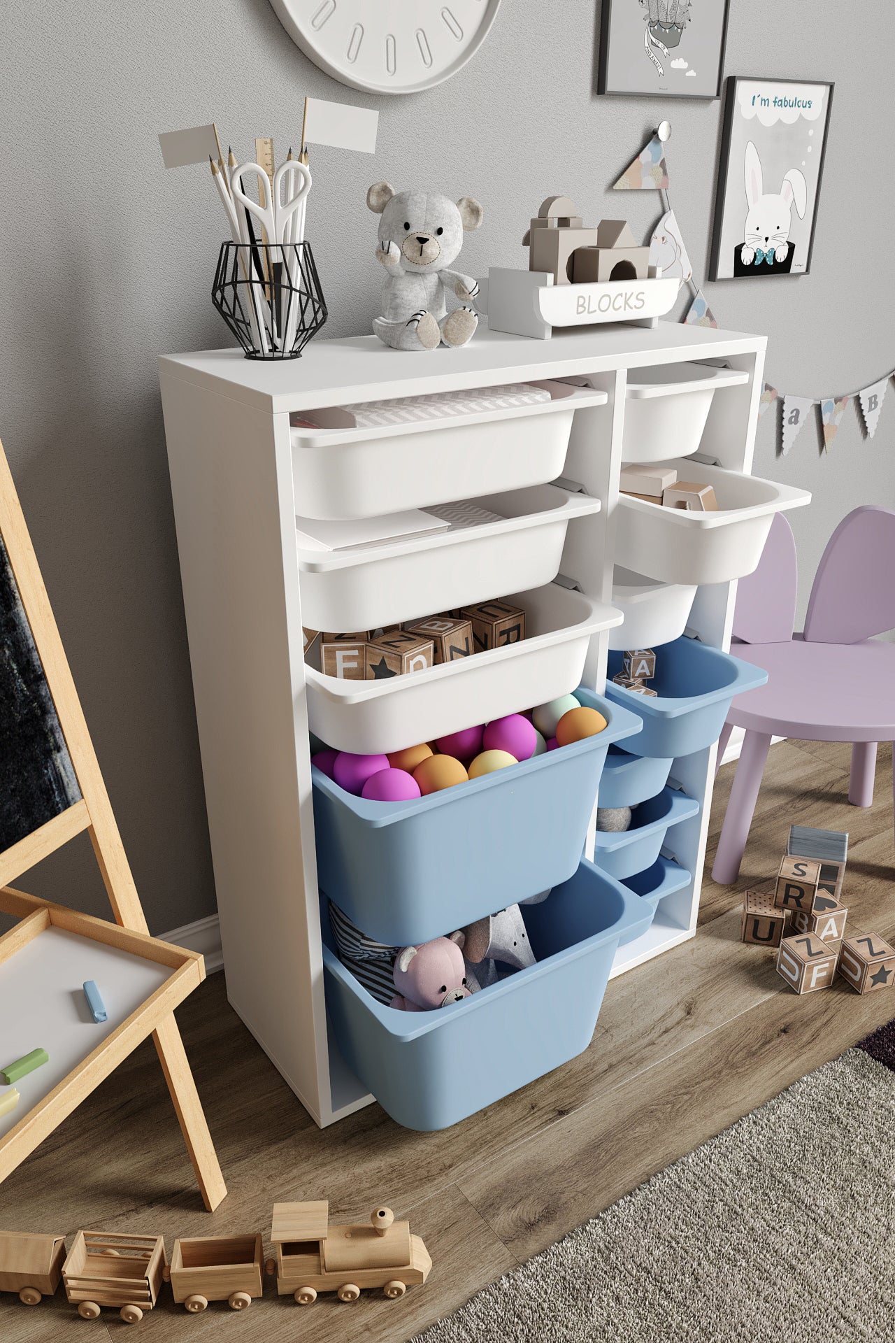 Spielzeugschrank aus 100 % MDF mit 12 Körben (2 große, 3 mittlere Körbe, 7 kleine Körbe)
