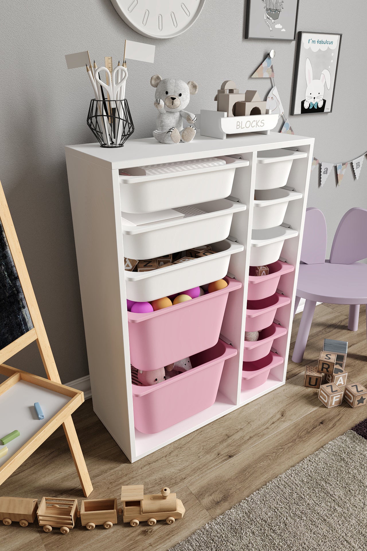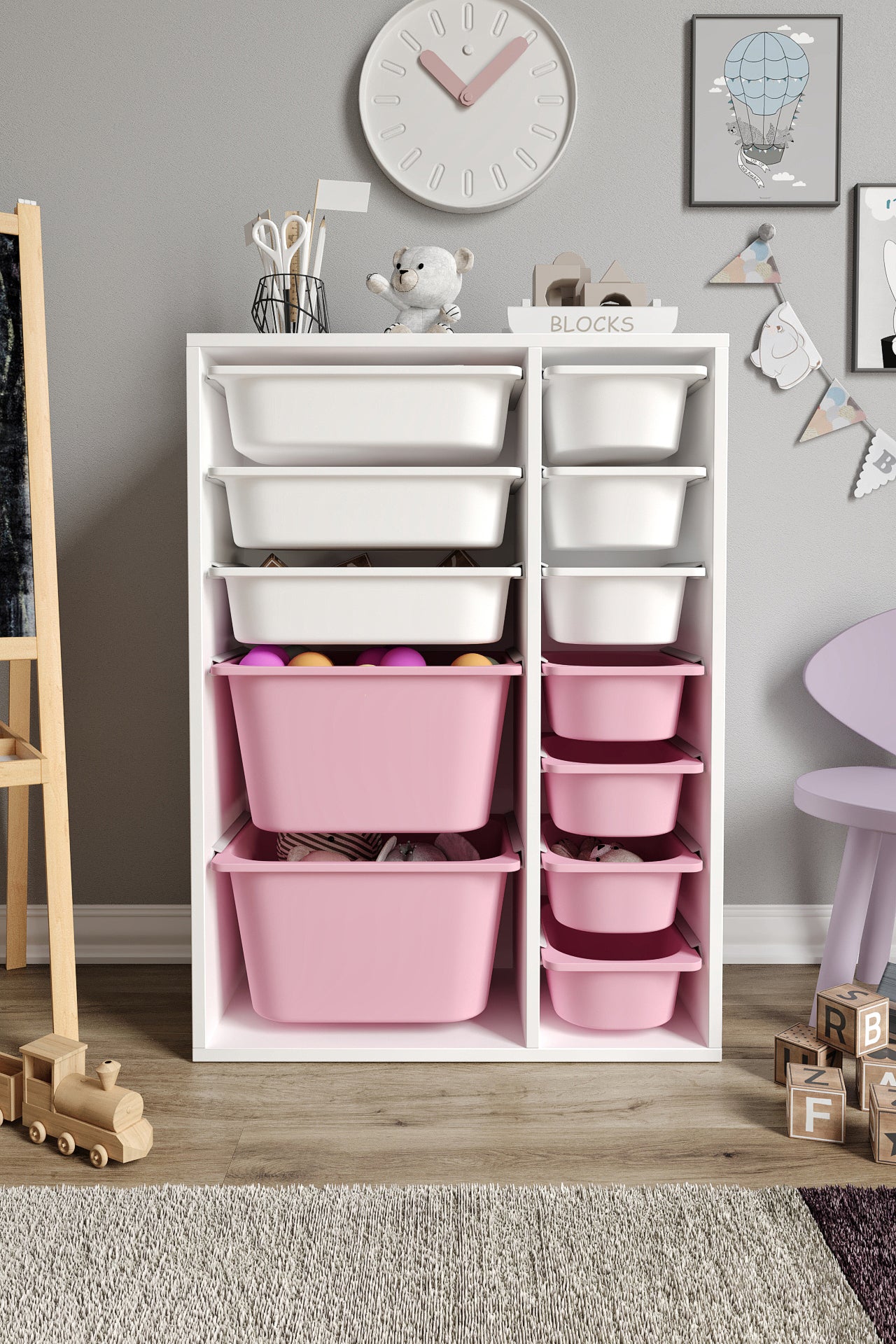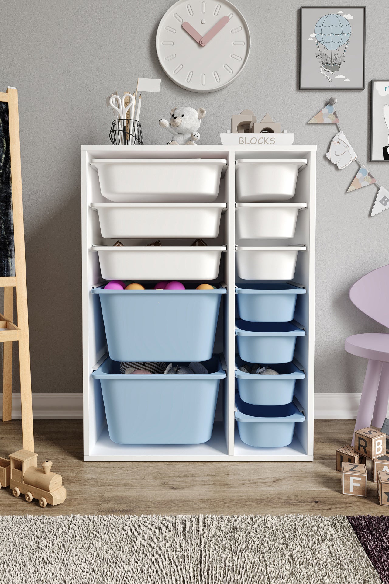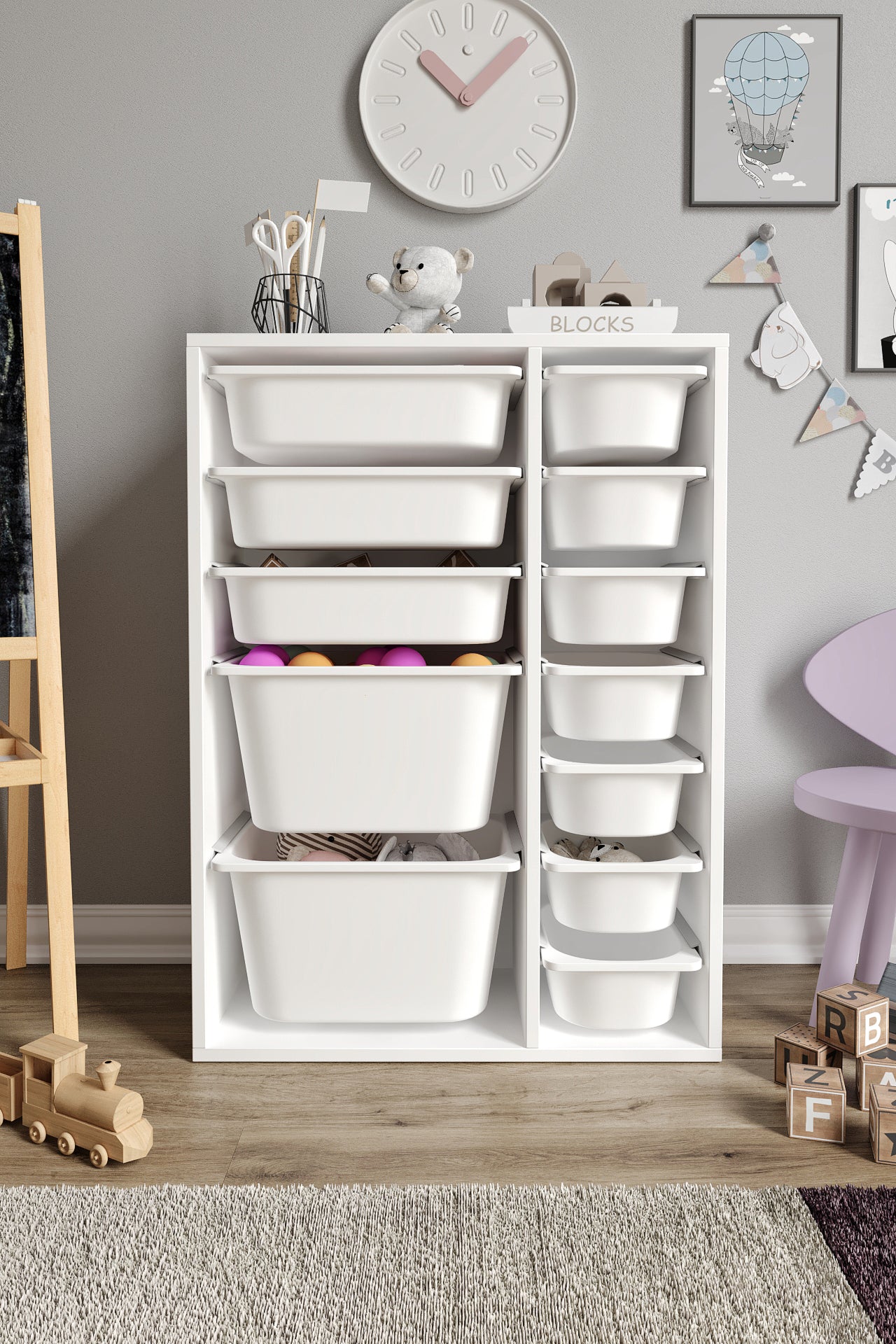 Spielzeugschrank aus 100 % MDF mit 12 Körben (2 große, 3 mittlere Körbe, 7 kleine Körbe)